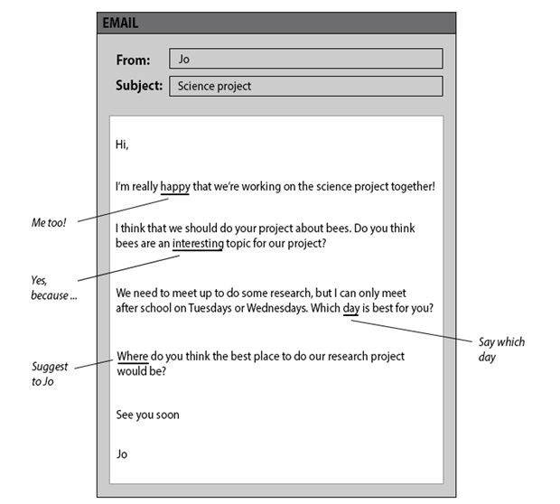 Writing exams generally award lower marks if learners simply lift vocabulary off the question paper rather than paraphrase the information provided to complete the task. For example, the new B1 Preliminary Part 1 Writing task requires learners to write an email in about 100 words using four note prompts in a situational email. Learners should always aim to rephrase the prompts and the language that appears in the email in order to receive higher marks. Importantly, they need to identify what type of information they need to write about, rephrase information in the email and add their own ideas.