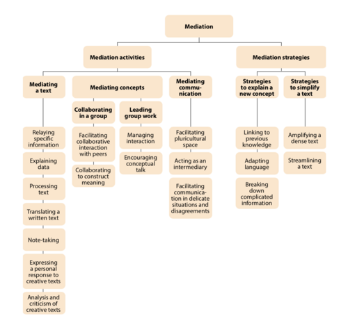- Mediating a text: using one's own words to pass on information to someone who does not have access to it;