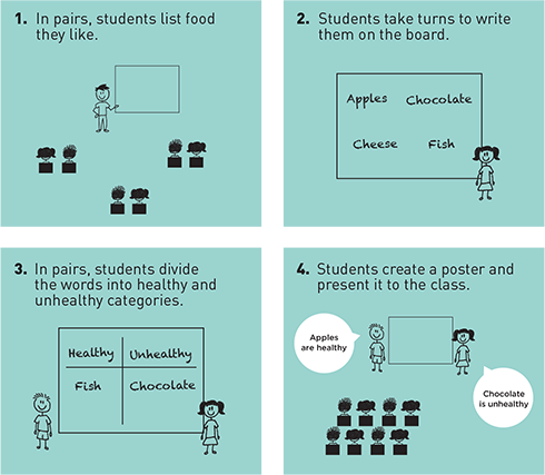 In the first activity of the 'I can... Can you?' series, children work together to present the different food they think are healthy and unhealthy.