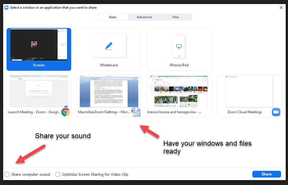 The fact that Zoom requires nearly all funcationality to be done through sharing your screen means that preparation is key. To make a Zoom session flow, you need to have all your PowerPoint slides, pictures, videos, PDF files and anything else you want to share ready. This means that when you click on the share button, all the files and windows will be ready to share.