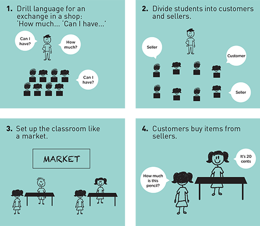 Practising language used in shops, students role play as customers and sellers in this activity and set up their own market in class.