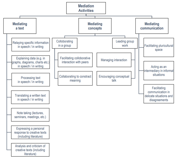 The new (2018) Companion Volume to the Common European Framework of Reference for Languages (CEFR CV) is a good place to start for the answer. The expanded and greatly developed illustrative descriptors and associated explanations in the CEFR CV break mediation down into three main areas: Mediating Texts, Mediating Concepts and Mediating Communication.